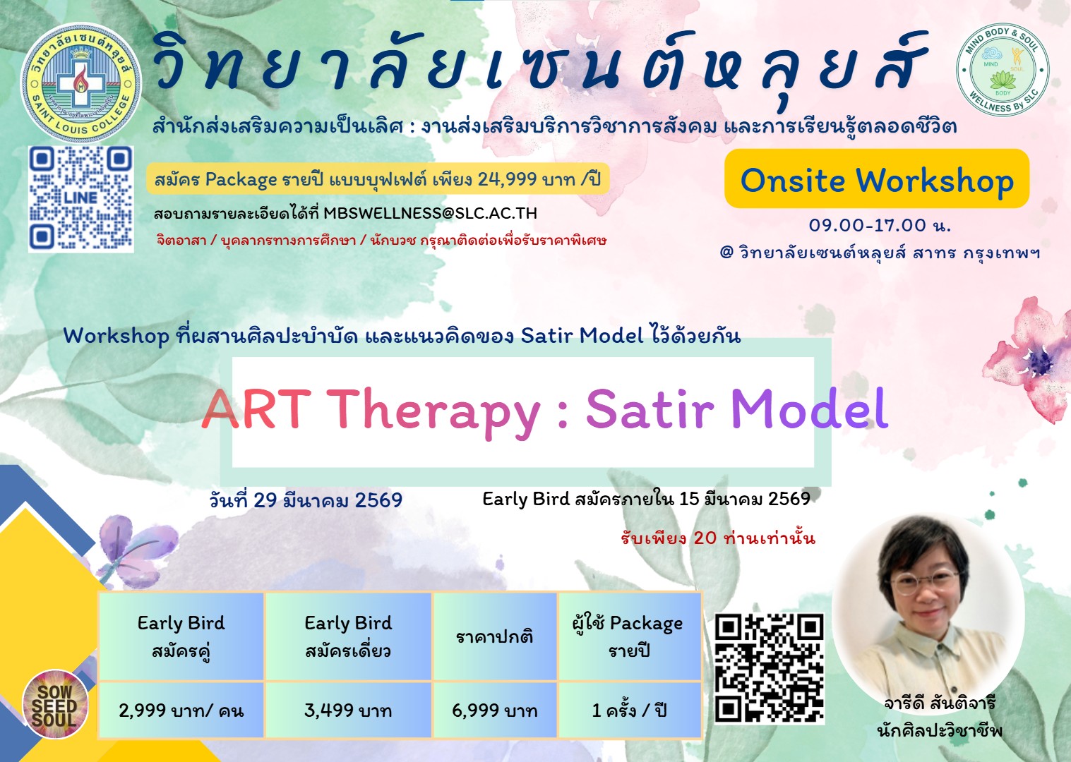 วิทยาลัยเซนต์หลุยส์ สาทร กรุงเทพฯ ยินดีเสนอ Workshop ที่ผสานศิลปะบำบัด และแนวคิดของ Satir Model ไว้ด้วยกัน “ART Therapy : Satir Model” Workshop แบบวันเดียว เวลา 09.00-16.00 น. วันที่ 29 มีนาคม 2569 สถานที่ : วิทยาลัยเซนต์หลุยส์ สาทร กรุงเทพฯ Early Bird สมัครคู่ 2,999 บาท / ท่าน รับสมัครรุ่นละ 20 ท่าน เท่านั้น ลงทะเบียนที่ https://forms.gle/