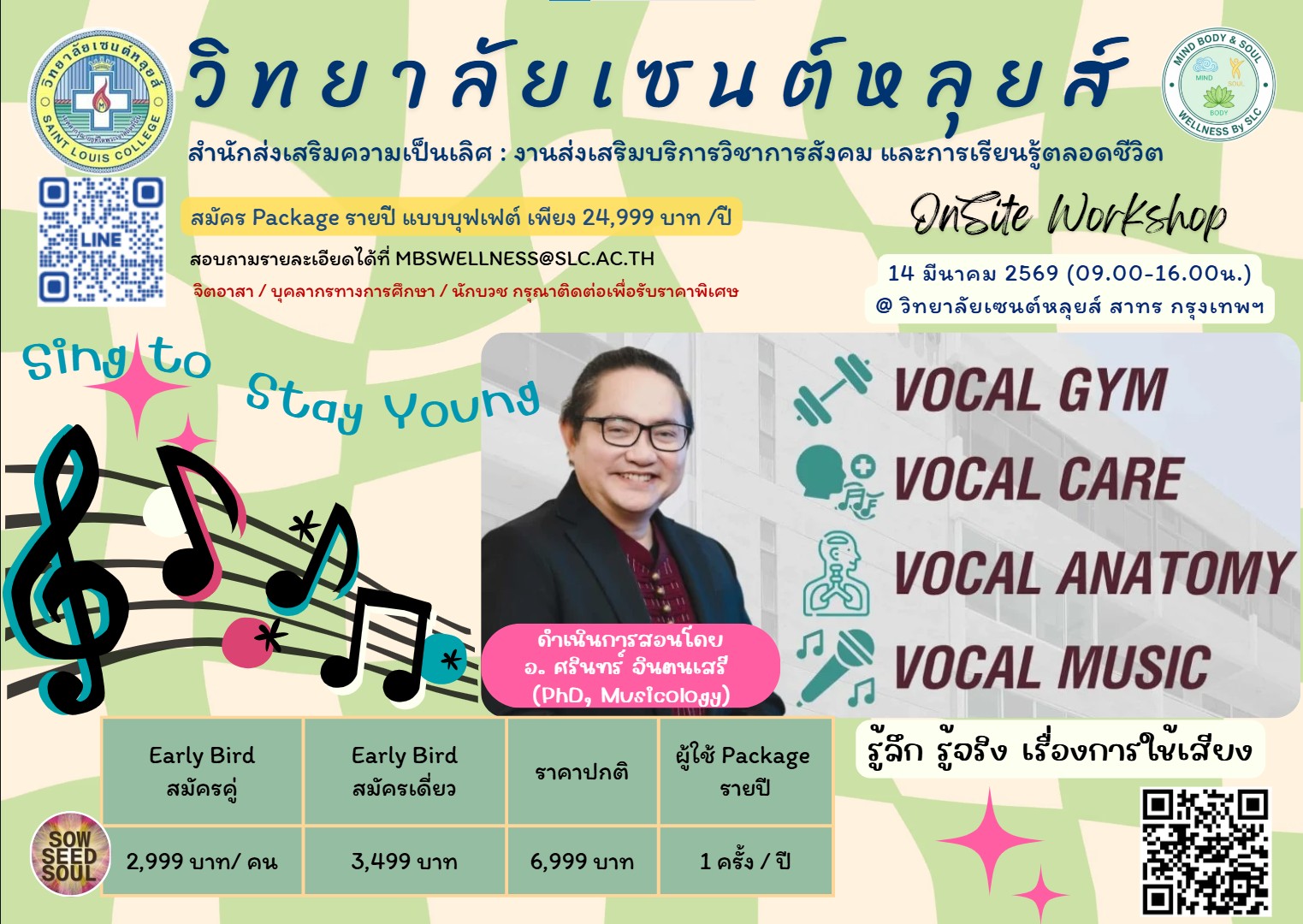 วิทยาลัยเซนต์หลุยส์ สาทร กรุงเทพฯ ยินดีเสนอ Sing to Stay Young ชะลอวัยด้วยเสียงเพลง รุ่น 2 เรียนรู้การดูแลสุขภาพเสียง (Geriatric Vocal Care) กิจกรรมนี้เหมาะกับ บุคคลทั่วไป ผู้สนใจดูแลฟื้นฟูเสียง แหบ แห้ง หาย ผู้ใช้เสียงในการทำงาน ไม่ว่าจะเป็น ครู โค้ช วิทยากร ผู้นำในองค์กร ผู้สอนกลุ่มร้องเพลงประสานเสียง นักร้อง และ โดย อ.ศรินทร์ จินตนเสรี (PhD, Musicology) ผู้อำนวยการหลักสูตรบ้านดนตรี