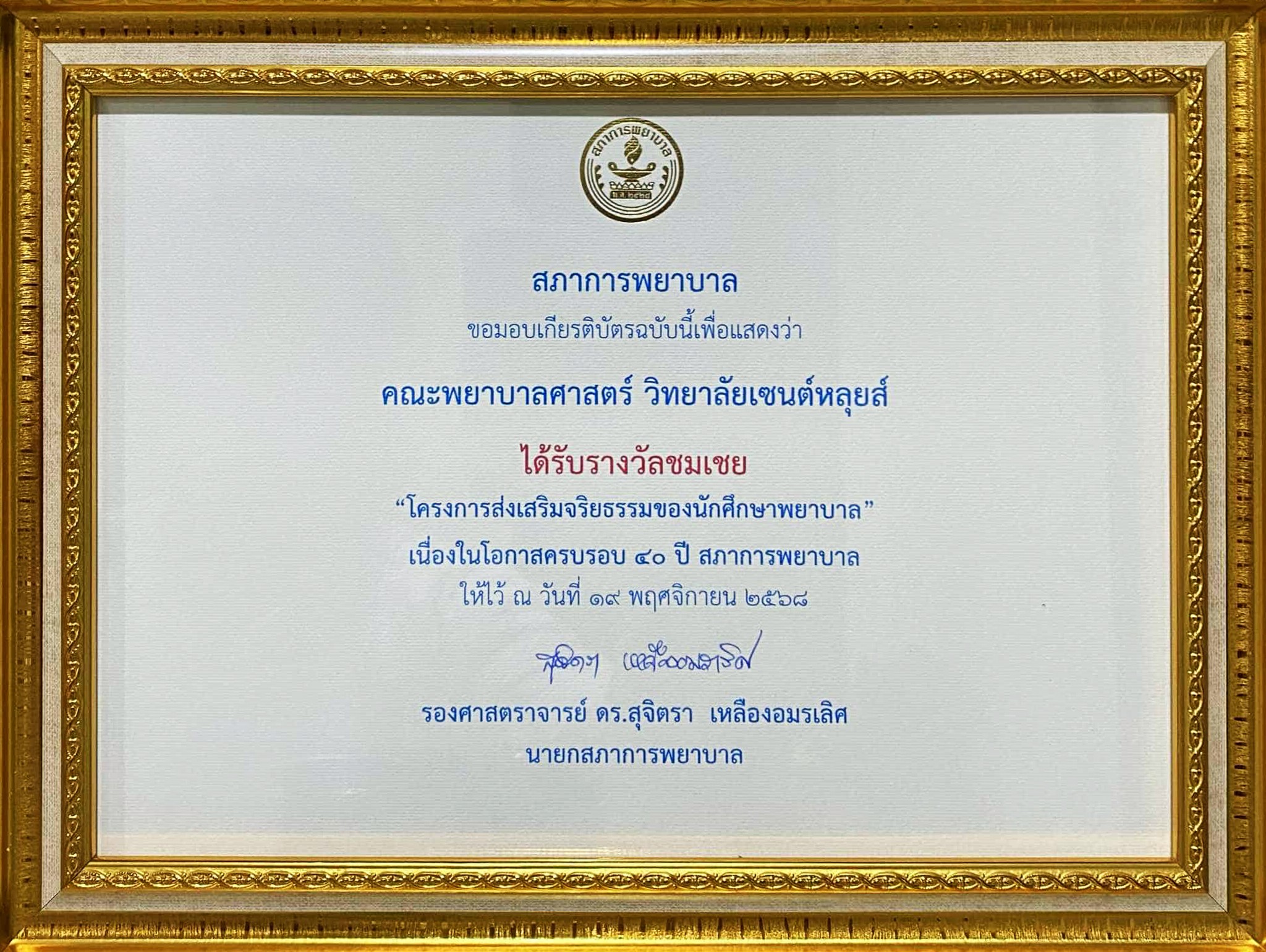 วิทยาลัยเซนต์หลุยส์แสดงความยินดี คณะพยาบาลศาสตร์ได้รับรางวัลชมเชย “โครงการส่งเสริมจริยธรรมของนักศึกษาพยาบาล” ในโอกาสครบรอบ 40 ปี สภาการพยาบาล