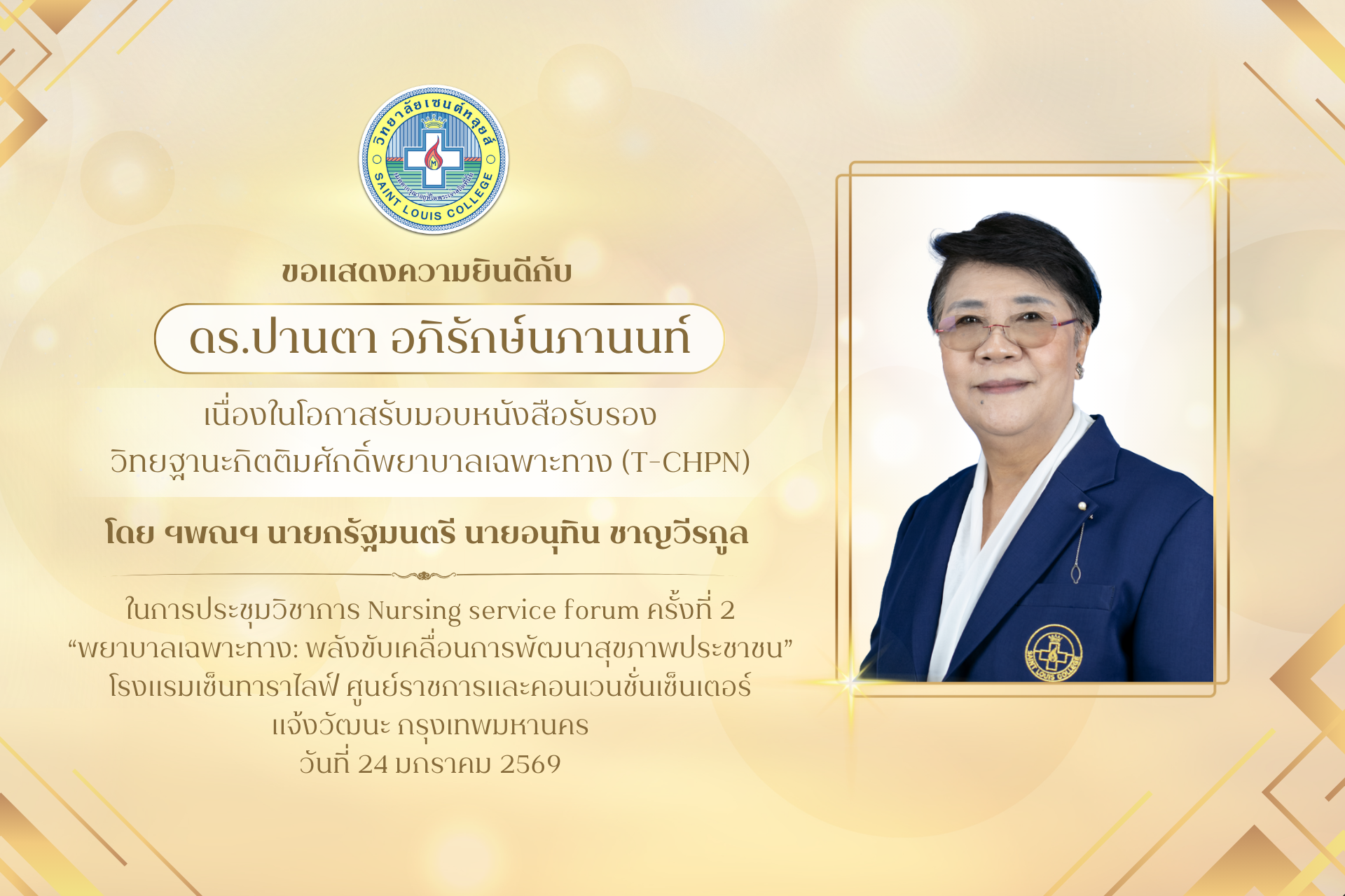 ขอแสดงความยินดี ดร.ปานตา อภิรักษ์นภานนท์ รับมอบหนังสือรับรองวิทยฐานะกิตติมศักดิ์พยาบาลเฉพาะทาง (T-CHPN)