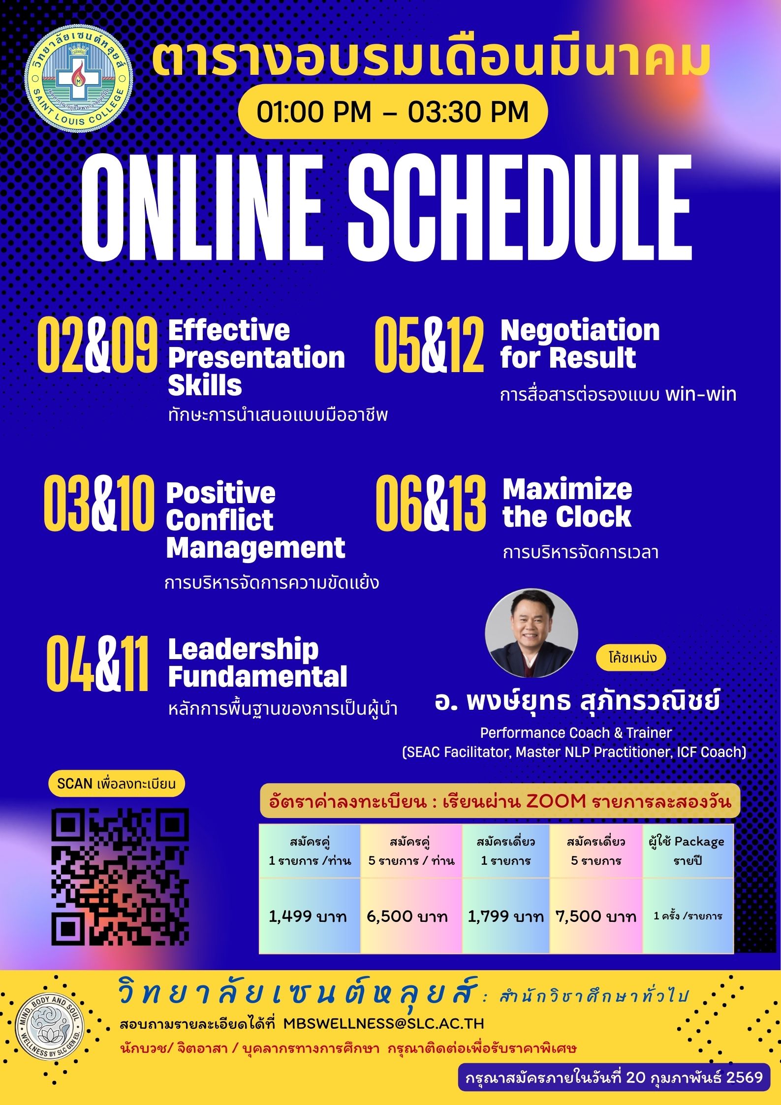 สำนักวิชาศึกษาทั่วไป วิทยาลัยเซนต์หลุยส์ ขอเสนอหลักสูตรออนไลน์เดือนมีนาคม 2569 เรียนผ่านระบบ ZOOM เวลา 13.00-15.30 น. เรียนวันธรรมดา รายการละสองวัน โดย : อ.พงษ์ยุทธ สุภัทรวณิชย์ (โค้ชเหน่ง) Performance Coach & Trainer (SEAC Facilitator, Master NLP Practitioner, ICF Coach) วันจันทร์ 2 และ 9 มีนาคม : ทักษะการนำเสนอแบบมืออาชีพ : Effective Presentation Skills วันอังคาร 3 และ 10 มีนาคม : การบริหารจัดการความขัดแย้ง : Positive Conflict Management วันพุธ 4 และ 11 มีนาคม : หลักการพื้นฐานของการเป็นผู้นำ : Leadership Fundamental วันพฤหัสบดี 5 และ 12 มีนาคม : การสื่อสารต่อรองแบบ win-win : Negotiation for Result วันศุกร์ 6 และ 13 มีนาคม : การบริหารจัดการเวลา : Maximize the Clock ลงทะเบียน https://forms.gle/Z5wefdL1fuernRod9 สอบถามเพิ่มเติม Line : https://lin.ee/RofhiAJ mbswellness@slc.ac.th กรุณาสมัครภายในวันที่ 20 กุมภาพันธ์ 2569
